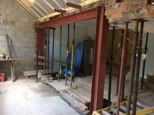 Steel Beams being supported by a genie lift and acrow props.[/caption]
